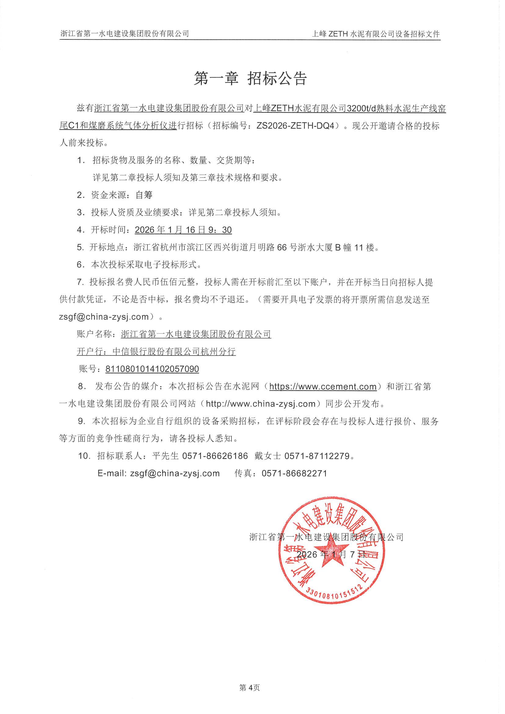 上峰ZETH水泥有限公司3200t/d熟料水泥生产线窑尾C1和煤磨系统气体分析仪招标公告